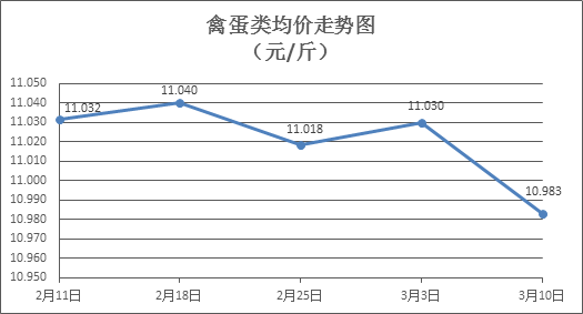 禽蛋類商品價(jià)格略有下降。上周所監(jiān)測的6種禽蛋類商品價(jià)格波動(dòng)情況為1漲3跌2平,綜合零售均價(jià)為10.983元/斤,環(huán)比下降0.42%。其中:白條雞、白條鴨零售均價(jià)分別為每斤20.29元、15.06元,環(huán)比分別下降0.59%、下降0.79%;白殼雞蛋、鴨蛋零售均價(jià)分別為每斤6.58元、7.69元,環(huán)比分別下降0.75%、持平。