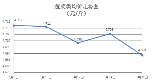 據(jù)本市21家農貿市場監(jiān)測數(shù)據(jù)顯示,上周(3月25日至3月31日,下同)市場上各類“菜籃子”商品供應充足,所監(jiān)測的7大類“菜籃子”商品價格1漲6跌。其中:糧食類商品價格基本平穩(wěn),食用油類、肉禽蛋類、蔬果類、水產類商品價格總體略降。近期天氣晴好,市場商品供應充足,價格總體略降,預計清明節(jié)期間消費有所提振,部分商品價格略有回升。