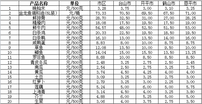 說明:1、表中價格為該地區(qū)監(jiān)測點綜合平均價;2、“市區(qū)”含蓬江區(qū)、江海區(qū)、新會區(qū),價格分別采自蓬江市場、江南市場、城東市場等13家農貿市場;3、其他四個縣市價格分別采自新華市場、錦江市場等8家農貿市場。