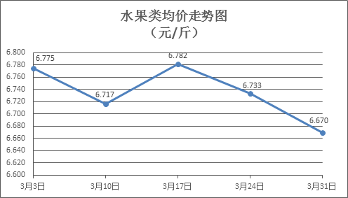 水果類商品價格窄幅波動。所監(jiān)測的6種水果商品價格波動情況為2漲2跌2平,綜合零售均價為每斤6.670元,環(huán)比下降0.94%。其中橙子、香蕉、葡萄零售均價分別為每斤5.28元、2.82元、15.12元,環(huán)比分別上漲1.54%、下降0.35%、下降3.08%。