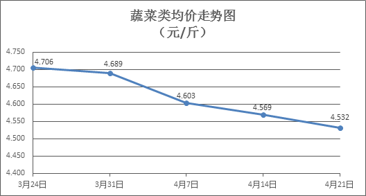 蔬菜類商品價格降多漲少。所監(jiān)測的32 種蔬菜商品價格波動情況為9漲21跌2平,綜合零售均價為每斤4.532元,環(huán)比下降0.81%。其中:漲幅居前的品種包括芥蘭、西紅柿、上海青,零售均價分別為每斤5.34元、3.77元、3.63元,環(huán)比分別上漲4.50%、4.43%、3.42%;跌幅靠前的品種包括苦瓜、絲瓜、西洋菜,零售均價分別為每斤5.40元、5.13元、3.44元,環(huán)比分別下降8.01%、4.82%、3.91%。