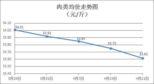 肉類商品價格總體微降。所監(jiān)測的8種肉類商品價格波動情況為1漲7跌,綜合零售均價為每斤33.62元,環(huán)比下降0.41%。其中:排骨、精瘦肉、有皮上肉、牛肉、帶骨羊肉零售均價分別為每斤29.15元、18.19元、14.29元、52.02元、43.63元,環(huán)比分別下降0.24%、下降0.05%、下降1.04%、下降0.71%、下降0.52%。