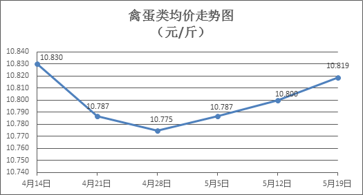 禽蛋類商品價(jià)格總體微漲。所監(jiān)測(cè)的6種禽蛋類商品價(jià)格波動(dòng)情況為4漲2跌,綜合零售均價(jià)為每斤10.818元,環(huán)比上漲0.17%。其中:白條雞、白條鴨零售均價(jià)分別為每斤20.08元、14.98元,環(huán)比分別上漲0.05%、上漲0.27%;紅殼雞蛋、咸鴨蛋零售均價(jià)分別為每斤7.21元、8.87元,環(huán)比分別上漲1.12%、上漲0.57%。