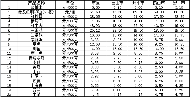 說明:1、表中價(jià)格為該地區(qū)監(jiān)測(cè)點(diǎn)綜合平均價(jià);2、“市區(qū)”含蓬江區(qū)、江海區(qū)、新會(huì)區(qū),價(jià)格分別采自蓬江市場(chǎng)、江南市場(chǎng)、城東市場(chǎng)等13家農(nóng)貿(mào)市場(chǎng);3、其他四個(gè)縣市價(jià)格分別采自新華市場(chǎng)、錦江市場(chǎng)等8家農(nóng)貿(mào)市場(chǎng)。