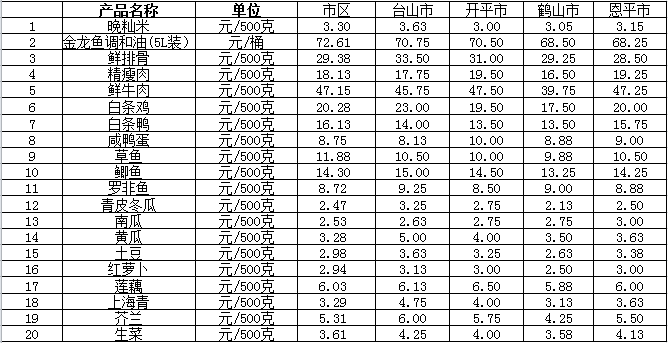 說明:1、表中價(jià)格為該地區(qū)監(jiān)測點(diǎn)綜合平均價(jià);2、“市區(qū)”含蓬江區(qū)、江海區(qū)、新會(huì)區(qū),價(jià)格分別采自蓬江市場、江南市場、城東市場等13家農(nóng)貿(mào)市場;3、其他四個(gè)縣市價(jià)格分別采自新華市場、錦江市場等8家農(nóng)貿(mào)市場。