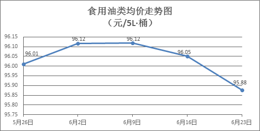 食用油類商品價(jià)格微幅下降。所監(jiān)測的9種食用油(5L裝)商品價(jià)格波動(dòng)情況為2漲6跌1平,綜合零售均價(jià)為每桶95.88元,環(huán)比下降0.18%。其中:魯花花生油、玉米油零售均價(jià)分別為每桶154.13元、76.65元,環(huán)比分別下降0.17%、下降0.39%。