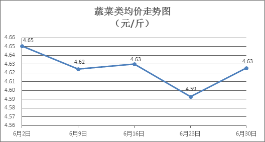 蔬菜類商品價格升降互現(xiàn)。所監(jiān)測的32 種蔬菜商品價格波動情況為18漲14跌,綜合零售均價為每斤4.63元,環(huán)比上漲0.71%。其中:漲幅居前的品種包括黃瓜、韭菜、絲瓜,零售均價分別為每斤3.79元、5.01元、4.95元,環(huán)比分別上漲11.14%、6.82%、3.34%;跌幅靠前的品種包括花菜、西紅柿、生菜,零售均價分別為每斤4.53元、4.28元、3.83元,環(huán)比分別下降3.00%、1.83%、1.54%。