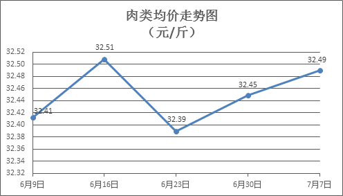 肉類商品價格升降互現(xiàn)。所監(jiān)測的8種肉類商品價格波動情況為4漲4跌,綜合零售均價為每斤32.49元,環(huán)比上漲0.13%。其中:排骨、精瘦肉、牛肉、帶骨羊肉零售均價分別為每斤30.27元、18.50元、46.60元、44.18元,環(huán)比分別上漲0.13%、下降0.05%、上漲0.63%、上漲0.66%。