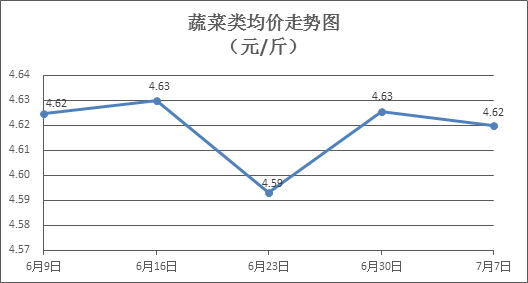 蔬菜類商品價格升降互現(xiàn)。所監(jiān)測的32 種蔬菜商品價格波動情況為13漲16跌3平,綜合零售均價為每斤4.62元,環(huán)比下降0.06%。其中:漲幅居前的品種包括黃瓜、花菜、白莧菜,零售均價分別為每斤4.06元、4.79元、4.35元,環(huán)比分別上漲7.12%、5.74%、1.40%;跌幅靠前的品種包括苦瓜、西紅柿、絲瓜,零售均價分別為每斤4.79元、4.11元、4.83元,環(huán)比分別下降6.63%、3.97%、2.42%。