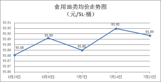 食用油類商品價(jià)格微幅波動(dòng)。所監(jiān)測(cè)的9種食用油(5L裝)商品價(jià)格波動(dòng)情況為3漲4跌2平,綜合零售均價(jià)為每桶95.89元,環(huán)比下降0.01%。其中:胡姬花花生油、玉米油零售均價(jià)分別為每桶145.50元、76.85元,環(huán)比分別下降0.07%、下降0.13%。