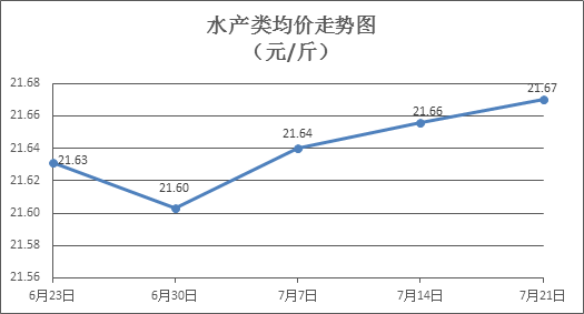 水產(chǎn)類商品價(jià)格微幅上漲。所監(jiān)測(cè)的10種水產(chǎn)商品價(jià)格波動(dòng)情況為5漲2跌3平,綜合均價(jià)為每斤21.67元,環(huán)比上漲0.06%。其中:草魚(yú)、鰱魚(yú)、鱸魚(yú)、羅非魚(yú)、基圍蝦零售均價(jià)分別為每斤11.26元、9.17元、21.71元、8.90元、29.82元,環(huán)比分別上漲0.45%、下降0.86%、上漲0.65%、上漲0.34%、下降0.40%。