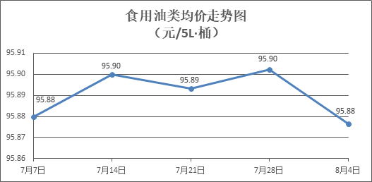 食用油類商品價格微幅波動。所監(jiān)測的9種食用油(5L裝)商品價格波動情況為2漲3跌4平,綜合零售均價為每桶95.88元,環(huán)比下降0.03%。其中:胡姬花花生油、菜籽油零售均價分別為每桶145.08元、73.15元,環(huán)比分別下降0.29%、上漲0.11%。