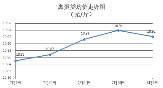 禽蛋類商品價格窄幅盤整。所監(jiān)測的6種禽蛋類商品價格波動情況為3漲2跌1平,綜合零售均價為每斤10.92元,環(huán)比下降0.17%。其中:白條雞、白條鴨零售均價分別為每斤19.95元、15.13元,環(huán)比分別下降0.15%、上漲0.07%;白殼雞蛋、咸鴨蛋零售均價分別為每斤6.53元、9.00元,環(huán)比分別上漲0.62%、持平。