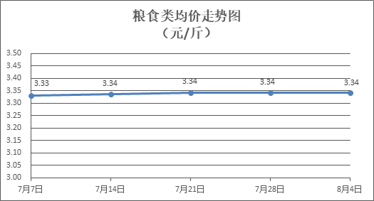 糧食類商品價格保持穩(wěn)定。所監(jiān)測的6種糧食類商品價格均持平,零售均價為每斤3.34元。其中:晚秈米、珍珠米、標(biāo)準粉零售均價分別為每斤3.30元、3.11元、3.17元,環(huán)比均持平。