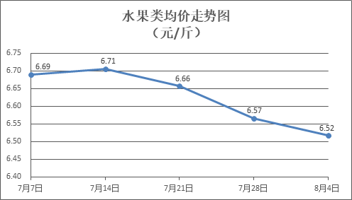 水果類商品價格走勢偏弱。所監(jiān)測的6種水果商品價格波動情況為2漲3跌1平,綜合零售均價為每斤6.52元,環(huán)比下降0.71%。其中橙子、葡萄、梨零售均價分別為每斤5.65元、13.93元、5.80元,環(huán)比分別下降0.18%、下降1.97%、上漲0.17%。