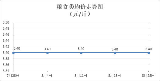糧食類商品價格基本平穩(wěn)。所監(jiān)測的4種糧食類商品價格均持平,零售均價為每斤3.40元。其中:絲苗米、富強粉零售均價分別為每斤3.60元、3.37元,環(huán)比均持平。