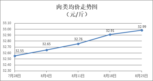 肉類商品價格微幅上漲。所監(jiān)測的8種肉類商品價格波動情況為6漲2跌,綜合零售均價為每斤32.99元,環(huán)比上漲0.22%。其中:排骨、精瘦肉、牛肉、帶骨羊肉零售均價分別為每斤32.84元、20.34元、45.46元、43.38元,環(huán)比分別上漲0.74%、上漲0.74%、上漲0.11%、下降0.12%。