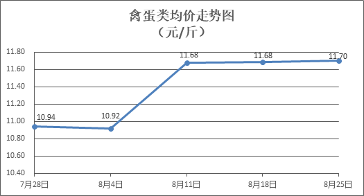 禽蛋類商品價格穩(wěn)中微漲。所監(jiān)測的5種禽蛋類商品價格波動情況為4漲1平,綜合零售均價為每斤11.70元,環(huán)比上漲0.15%。其中:白條雞、白條鴨零售均價分別為每斤20.05元、15.24元,環(huán)比分別上漲0.15%、上漲0.07%;白殼雞蛋、鴨蛋零售均價分別為每斤6.52元、7.70元,環(huán)比分別上漲0.46%、上漲0.26%。
