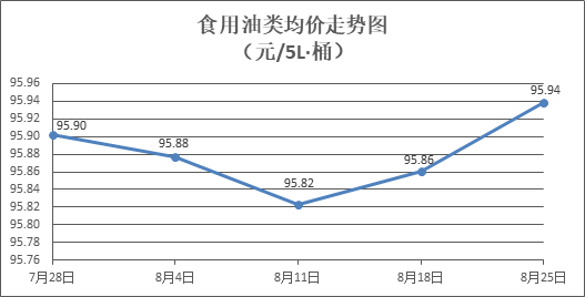 食用油類商品價格微幅盤整。所監(jiān)測的9種食用油(5L裝)商品價格波動情況為3漲2跌4平,綜合零售均價為每桶95.94元,環(huán)比上漲0.08%。其中:胡姬花花生油、玉米油零售均價分別為每桶144.75元、77.60元,環(huán)比分別持平、上漲0.08%。