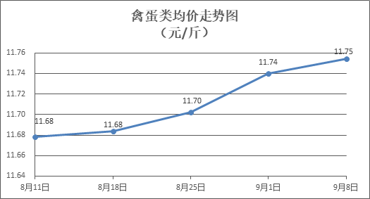 禽蛋類商品價(jià)格微幅上漲。所監(jiān)測的5種禽蛋類商品價(jià)格波動情況為4漲1跌,綜合零售均價(jià)為每斤11.75元,環(huán)比上漲0.12%。其中:白條雞、白條鴨零售均價(jià)分別為每斤20.10元、15.36元,環(huán)比分別上漲0.05%、上漲0.26%;白殼雞蛋、鴨蛋零售均價(jià)分別為每斤6.49元、7.75元,環(huán)比分別下降0.46%、上漲0.26%。