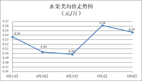 水果類商品價(jià)格窄幅盤整。所監(jiān)測的6種水果商品價(jià)格波動情況為3漲3跌,綜合零售均價(jià)為每斤6.55元,環(huán)比下降0.23%。其中橙子、蘋果、梨零售均價(jià)分別為每斤6.05元、7.48元、5.71元,環(huán)比分別上漲1.68%、下降0.66%、下降0.17%。