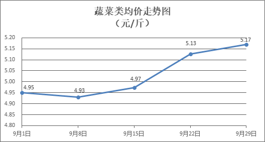 蔬菜類商品價格以漲為主。所監(jiān)測的32 種蔬菜商品價格波動情況為21漲10跌1平,綜合零售均價為每斤5.17元,環(huán)比上漲0.87%。其中:漲幅居前的品種包括西紅柿、花菜、本地菜心,零售均價分別為每斤5.69元、6.35元、6.44元,環(huán)比分別上漲6.75%、6.72%、4.89%;跌幅靠前的品種包括西洋菜、青豆角、絲瓜,零售均價分別為每斤6.24元、5.72元、5.15元,環(huán)比分別下降3.41%、2.72%、1.90%。