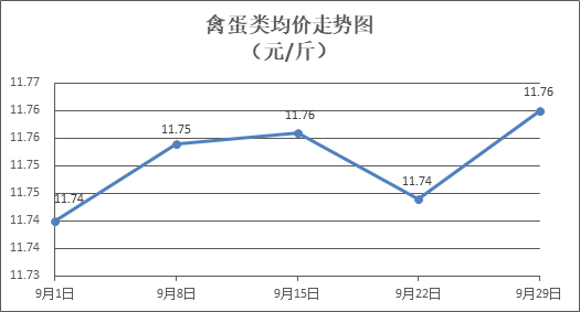 禽蛋類商品價格小幅波動。所監(jiān)測的5種禽蛋類商品價格波動情況為2漲1跌2平,綜合零售均價為每斤11.76元,環(huán)比上漲0.14%。其中:白條雞、白條鴨零售均價分別為每斤20.21元、15.32元,環(huán)比分別上漲0.20%、持平;雞蛋、鴨蛋零售均價分別為每斤6.54元、7.72元,環(huán)比分別持平、上漲1.18%。