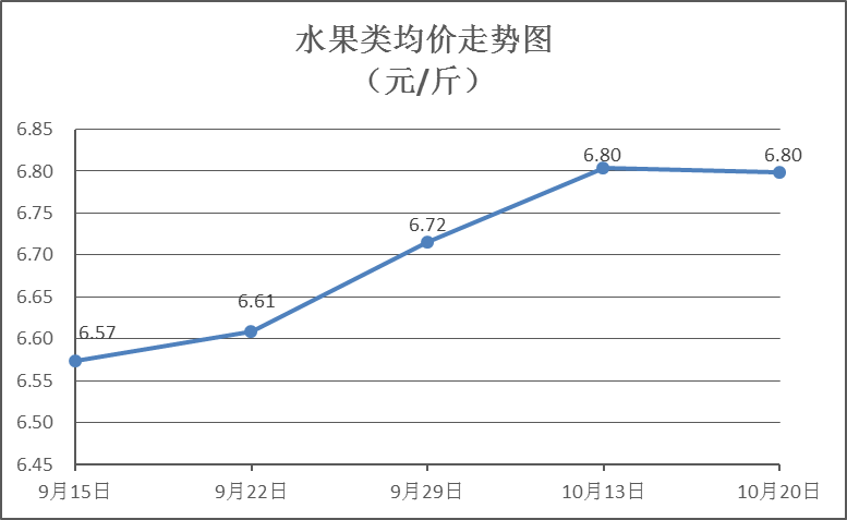 水果類商品價(jià)格微幅波動(dòng)。所監(jiān)測的6種水果商品價(jià)格波動(dòng)情況為4漲2跌,綜合零售均價(jià)為每斤6.80元,環(huán)比下降0.07%。其中橙子、蘋果、葡萄零售均價(jià)分別為每斤6.79元、7.48元、13.62元,環(huán)比分別下降2.30%、下降0.53%、上漲0.44%。