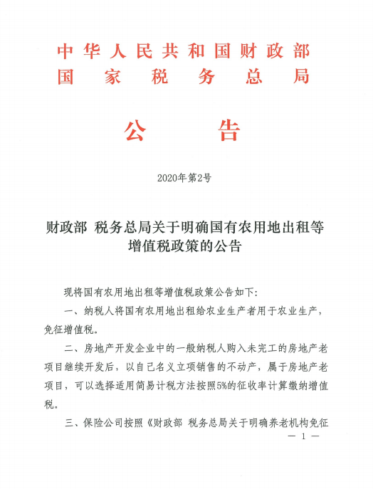 財政部+稅務(wù)總局關(guān)于明確國有農(nóng)用地出租等增值稅政策的公告
