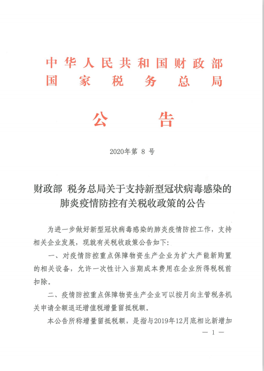 財(cái)政部+稅務(wù)總局關(guān)于支持新型冠狀病毒感染的肺炎疫情防控有關(guān)稅收政策的公告