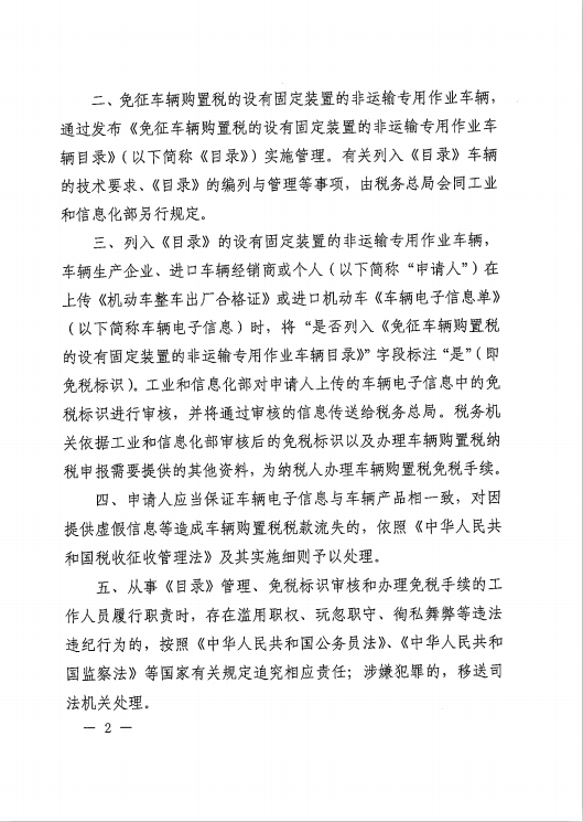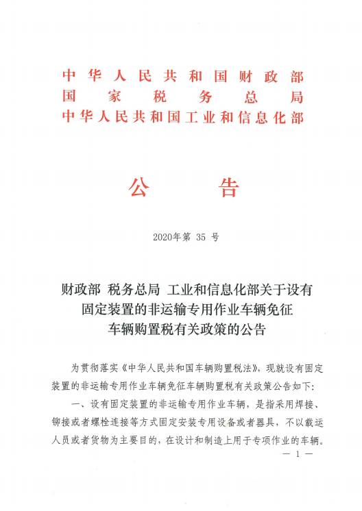財政部+稅務總局+工業(yè)和信息化部關于設有固定裝置的非運輸專用作業(yè)車輛免征車輛購置稅有關政策的公告