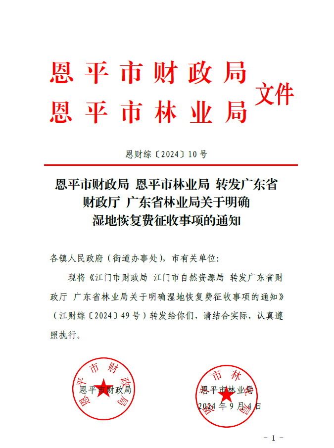 恩平市財(cái)政局 恩平市林業(yè)局 轉(zhuǎn)發(fā)廣東省財(cái)政廳 廣東省林業(yè)局關(guān)于明確濕地恢復(fù)費(fèi)征收事項(xiàng)的通知
