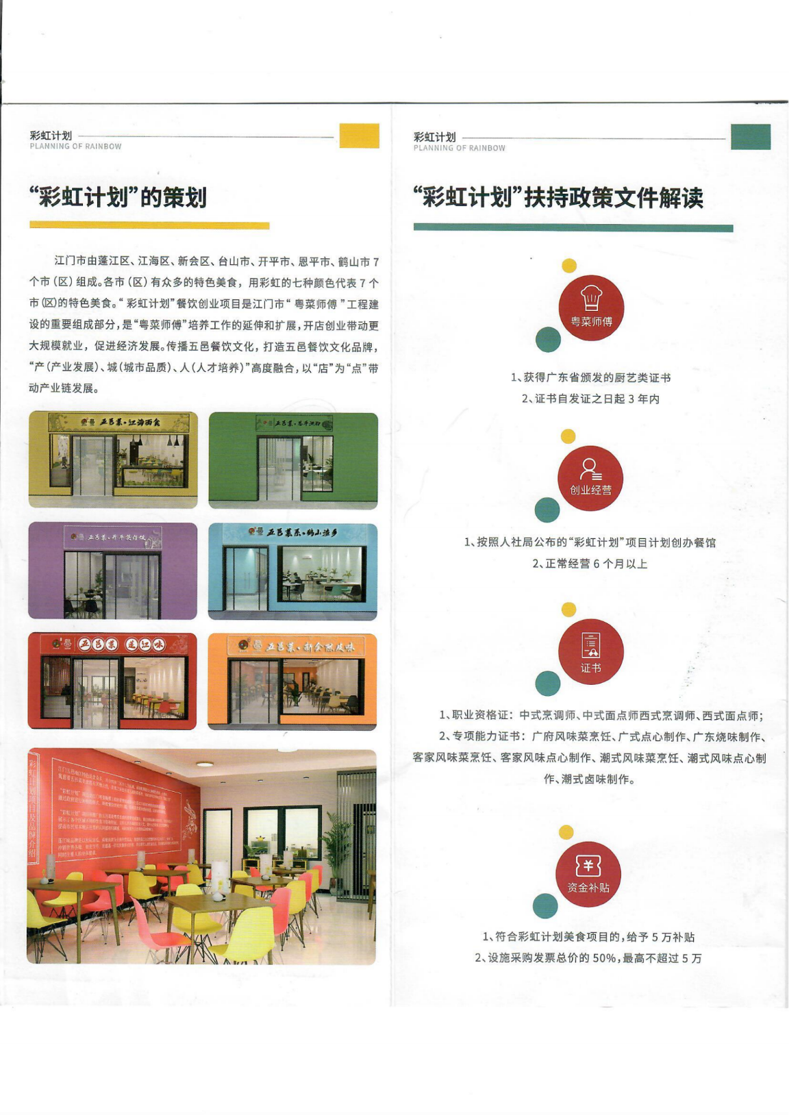 該補貼分兩部分,其中符合“五邑菜系”彩虹計劃美食項目的,給予5萬元的補貼,設施采購按照所采購發(fā)票總價的50%給予補貼,最高不超過5萬元,合共最高補貼10萬元。