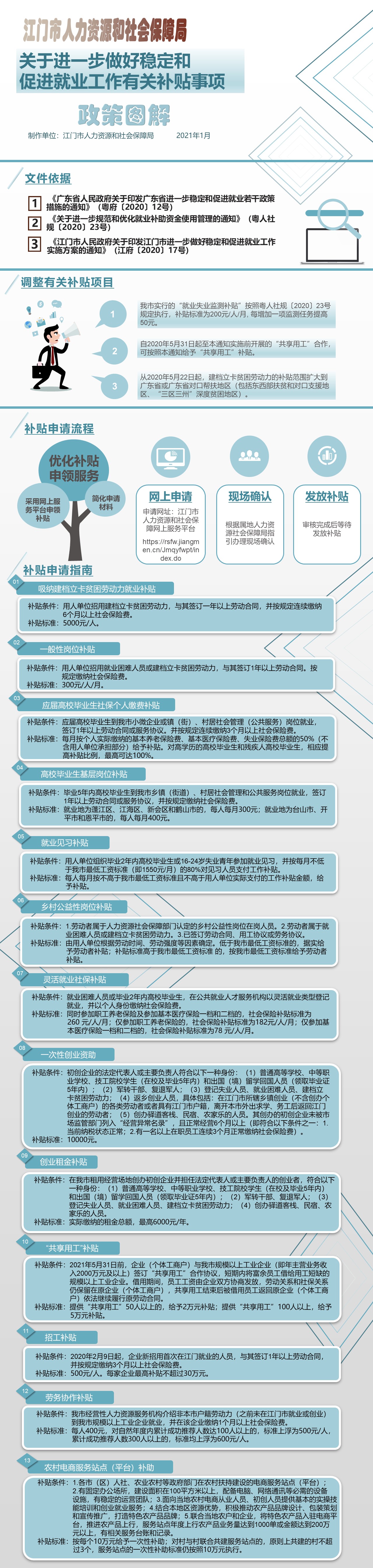 - 一圖讀懂《江門市人力資源和社會(huì)保障局關(guān)于進(jìn)一步做好穩(wěn)定和促進(jìn)就業(yè)工作有關(guān)補(bǔ)貼事項(xiàng)》 2021-01-26