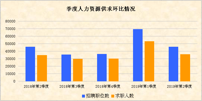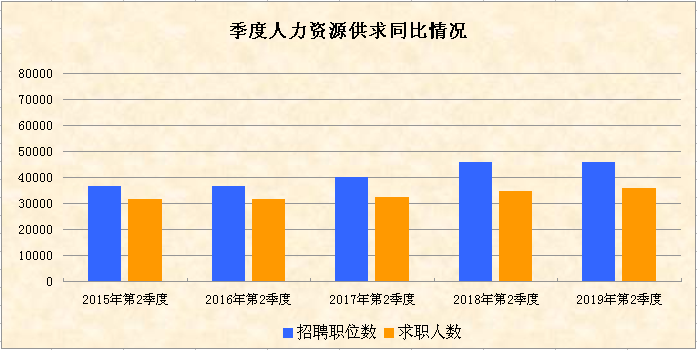 第二季度,我市企業(yè)招聘職位數(shù)為45884個,比上季度減少了23470個,環(huán)比下降33.84%;求職人數(shù)為35930人,比上季度減少17282人,環(huán)比下降32.48%。全市各類企業(yè)用工在經(jīng)歷了第一季度的自然流動和補(bǔ)充后春節(jié)后企業(yè)的招工潮及異地務(wù)工人員的返工潮,第二季度招聘職位和求職人數(shù)比上季度均有不同程度的下降,人力資源供求規(guī)模整體在縮減。與2018年第二季度相比,我市人力資源市場供求規(guī)模輕微增大,其中招聘職位數(shù)同比增加203個,上升0.44%,求職人數(shù)同比增加1475人,上升4.28%。