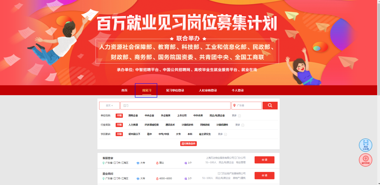 查閱就業(yè)見習(xí)崗位信息:登錄“百萬(wàn)就業(yè)見習(xí)崗位中智平臺(tái)”(https://ht.myjob500.com/rsbwjx/home)可查閱全國(guó)各地的就業(yè)見習(xí)崗位信息。