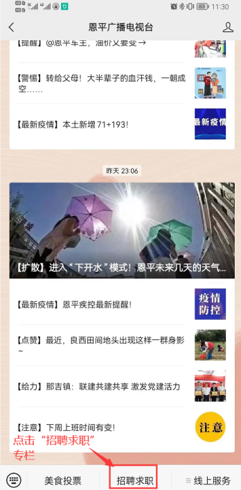 打開“恩平廣播電視臺(tái)”微信公眾號(hào),點(diǎn)擊“招聘求職”專欄;