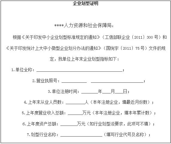 企業(yè)的劃型可以由企業(yè)本身自行出具書(shū)面證明,主要填寫(xiě)本單位上年度從業(yè)人數(shù)、營(yíng)業(yè)收入情況和所屬行業(yè)三個(gè)要素,加蓋企業(yè)公章,具體的樣式可從江門(mén)市人力資源和社會(huì)保障局官方網(wǎng)站中右上角的“就業(yè)補(bǔ)貼”欄目下載參考,也可以關(guān)注江門(mén)市人力資源和社會(huì)保障局官方微信“五邑人社”進(jìn)行查看。企業(yè)提交證明后由受理申請(qǐng)的人力資源社會(huì)保障部門(mén)根據(jù)法律法規(guī)直接進(jìn)行核定。