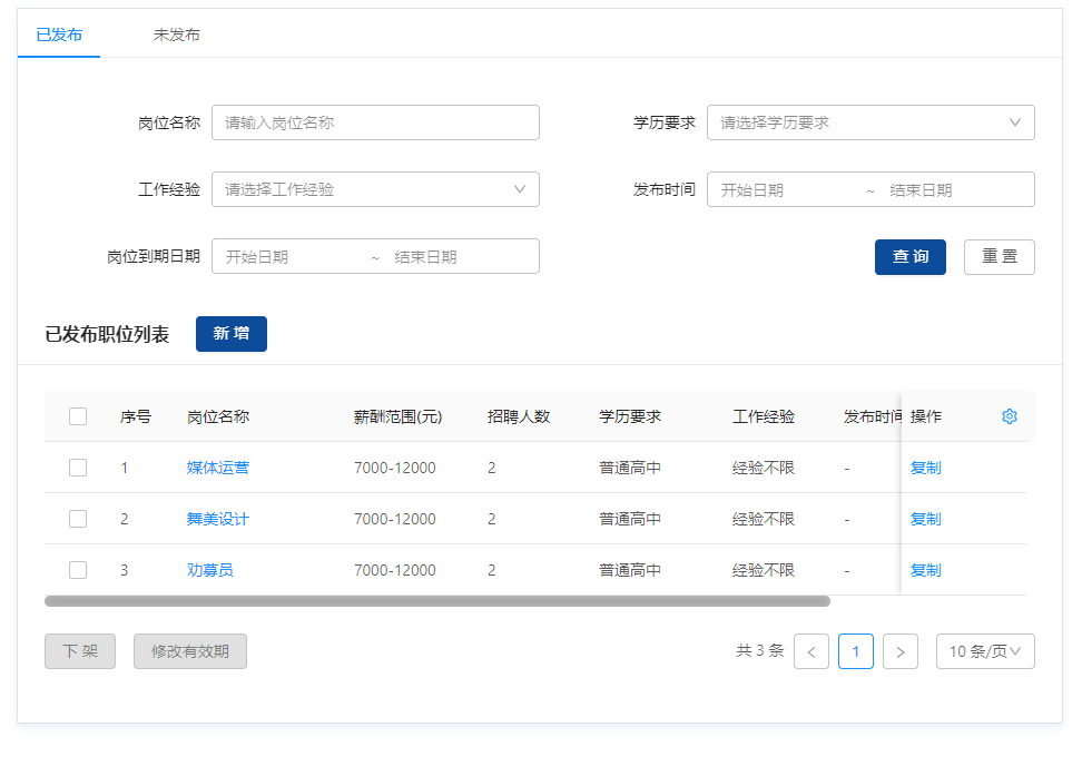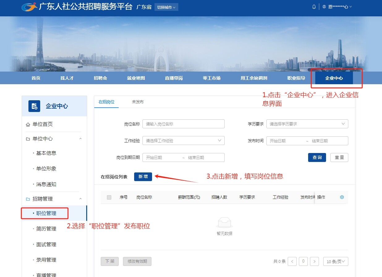 1.點擊“企業(yè)中心”,進入企業(yè)信息界面,選擇“招聘管理”模塊,點擊職位管理,進入崗位錄入。