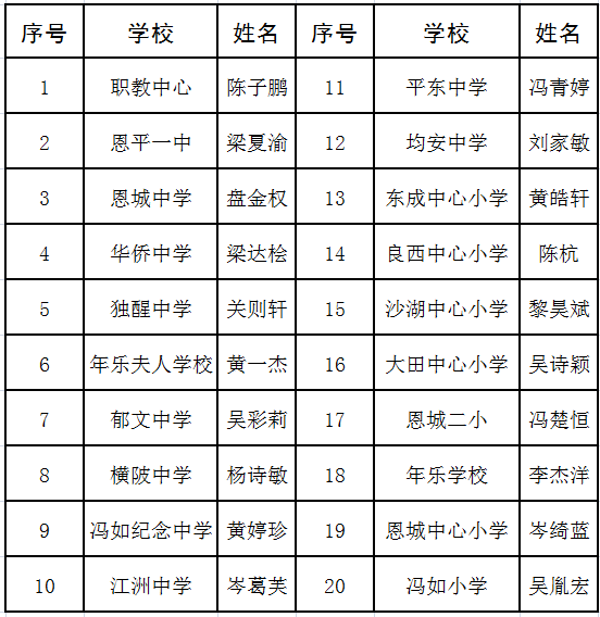 為引導(dǎo)廣大青少年學(xué)生學(xué)習(xí)和踐行社會(huì)主義核心價(jià)值觀,幫助未成年人“扣好人生第一??圩印?,充分發(fā)揮先進(jìn)典型的示范引領(lǐng)作用,市教育局開展了2020年恩平市“新時(shí)代好少年”學(xué)習(xí)宣傳活動(dòng)。經(jīng)過學(xué)校推薦、組織評(píng)選,擬定20名上半年恩平市“新時(shí)代好少年”。為確保評(píng)選活動(dòng)公平、公開、公正,現(xiàn)將2020年上半年恩平市 “新時(shí)代好少年”候選名單進(jìn)行公示。