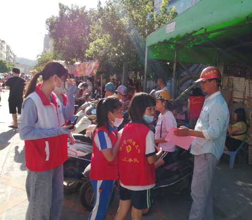 志愿者給路過的學(xué)生、群眾分發(fā)創(chuàng)文宣傳小冊(cè)子