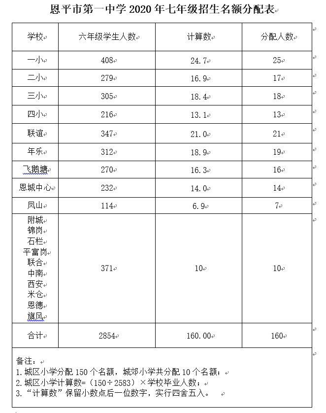 采用多校劃片的方式面向恩城街道辦事處各小學(xué)招生160人;另招收政策照顧生約20人。合計招生180人。