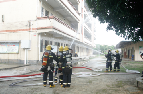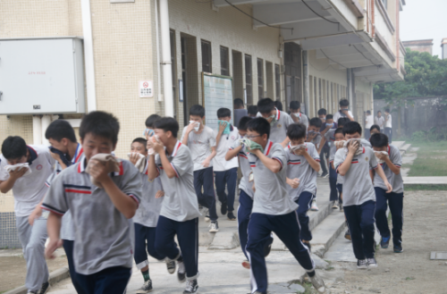 此次演練在宿舍進行。當天下午四點,警報響起,安全應急疏散演練開始。信號組得到命令后立即發(fā)出警報信號,在老師的組織下,學生每人用濕毛巾捂住口鼻,彎腰迅速有序逃出宿舍大樓,到達指定地點集中。隨后,各班迅速整隊,清點人數(shù),匯報人數(shù)。整合完畢,消防隊員開展消防知識普及課堂,向師生們講解消防知識,指導師生們掌握滅火方法。