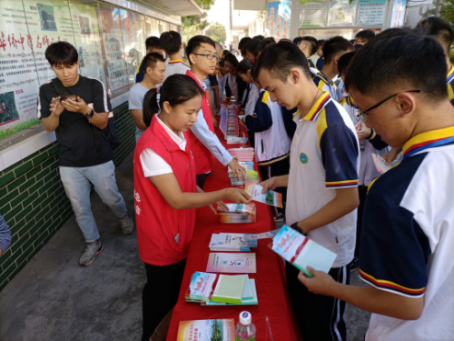 恩平市司法局禁毒宣傳工作人員向?qū)W生發(fā)放禁毒宣傳手冊(cè)