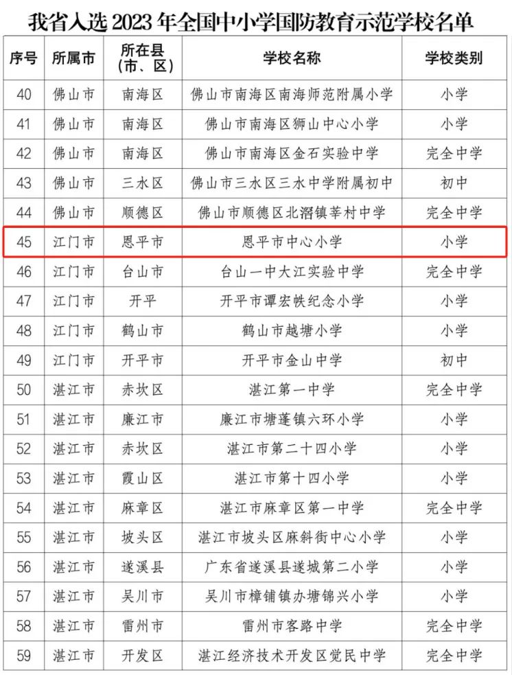 近日,教育部、中央軍委政治工作部公布2023年全國中小學國防教育示范學校名單,我市恩城中心小學榜上有名,斬獲國家級榮譽!