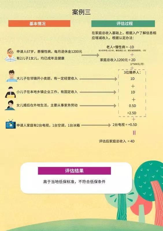 在具體操作上,《認(rèn)定辦法》規(guī)定,家庭生活狀況綜合評(píng)估指標(biāo)以申請(qǐng)家庭申請(qǐng)前6個(gè)月平均收入為基礎(chǔ),根據(jù)家庭結(jié)構(gòu)和生活狀況對(duì)家庭月平均收入,按照評(píng)估指標(biāo)(以“當(dāng)?shù)?個(gè)月最低生活保障標(biāo)準(zhǔn)”作為各指標(biāo)計(jì)量單位)進(jìn)行增加或減除,將增減后的家庭月收入除以共同生活的家庭成員人數(shù),計(jì)算出綜合評(píng)估后家庭月人均收入,作為認(rèn)定申請(qǐng)家庭是否納入最低生活保障的依據(jù)。