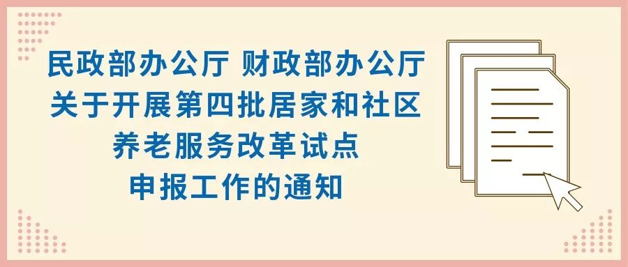 近日,民政部、財(cái)政部聯(lián)合印發(fā)《關(guān)于開展第四批居家和社區(qū)養(yǎng)老服務(wù)改革試點(diǎn)申報(bào)工作的通知》【點(diǎn)擊“閱讀原文”查看通知全文及相關(guān)附件】。第四批居家和社區(qū)養(yǎng)老服務(wù)改革試點(diǎn)申報(bào)主體及條件是什么?申報(bào)材料主要包括哪些內(nèi)容?試點(diǎn)任務(wù)及重點(diǎn)領(lǐng)域有哪些?小編帶您一起看↓↓↓