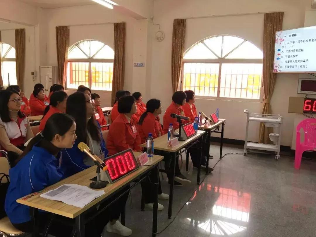本次比賽分別設(shè)置團(tuán)體賽和個(gè)人賽兩個(gè)環(huán)節(jié),團(tuán)體賽主要考察理論知識(shí),個(gè)人賽主要考察護(hù)理人員的技能操作,共有來(lái)自全市各鎮(zhèn)街的15名護(hù)理人員參加比賽。