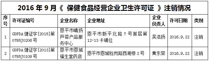 恩平市2016年9月《保健食品經(jīng)營(yíng)企業(yè)衛(wèi)生許可證》、《食品經(jīng)營(yíng)許可證》(保健食品)許可公示