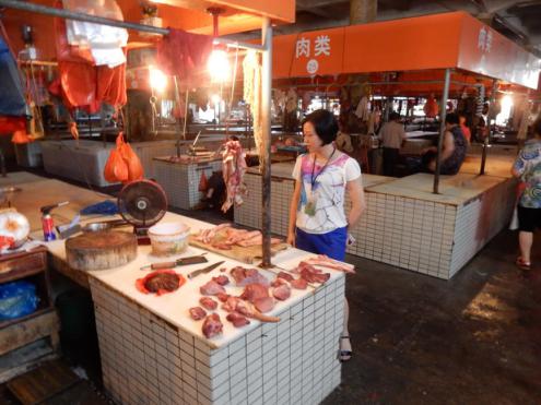 市食品藥監(jiān)局執(zhí)法人員對(duì)市場(chǎng)內(nèi)豬肉經(jīng)營(yíng)戶(hù)進(jìn)行現(xiàn)場(chǎng)檢查